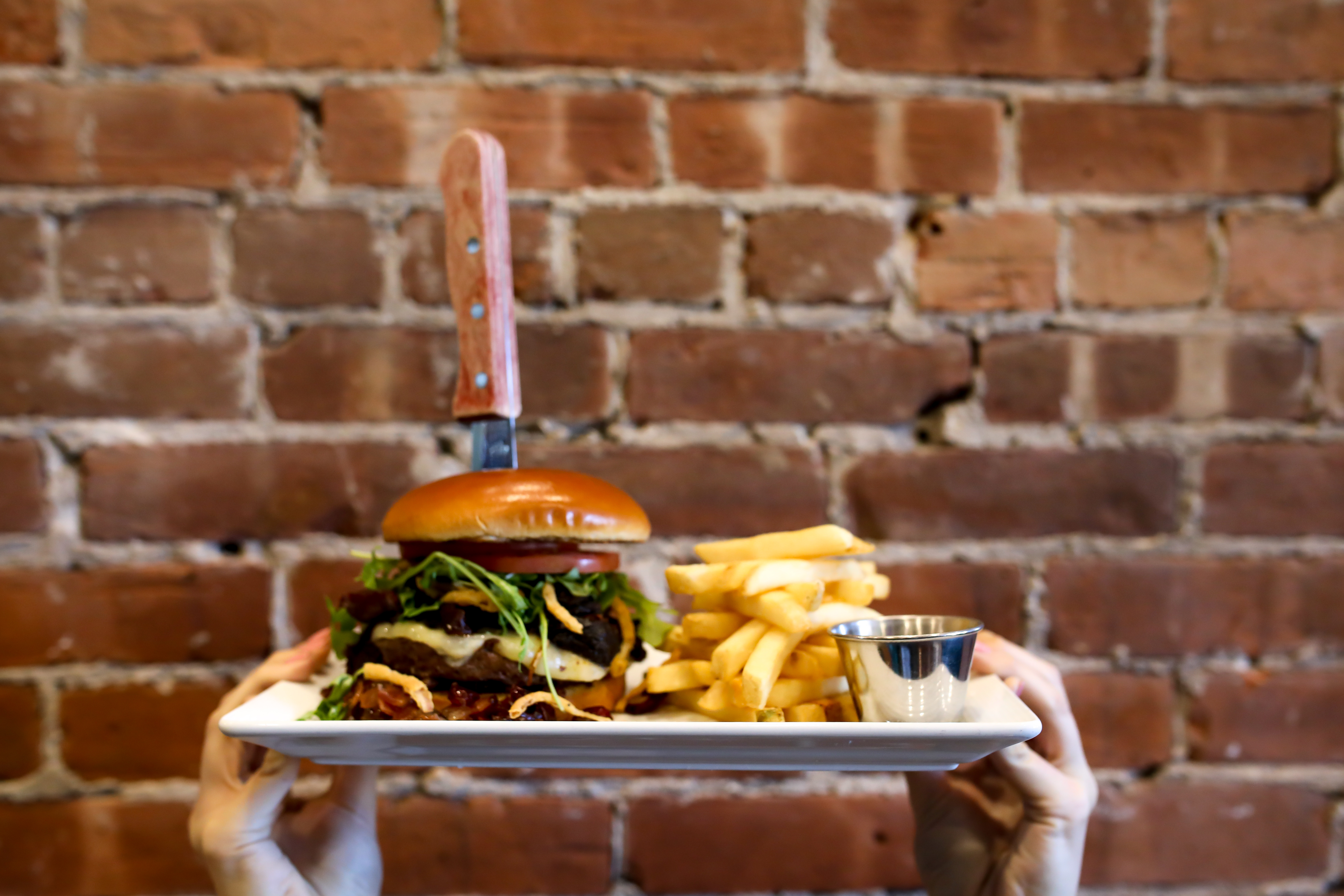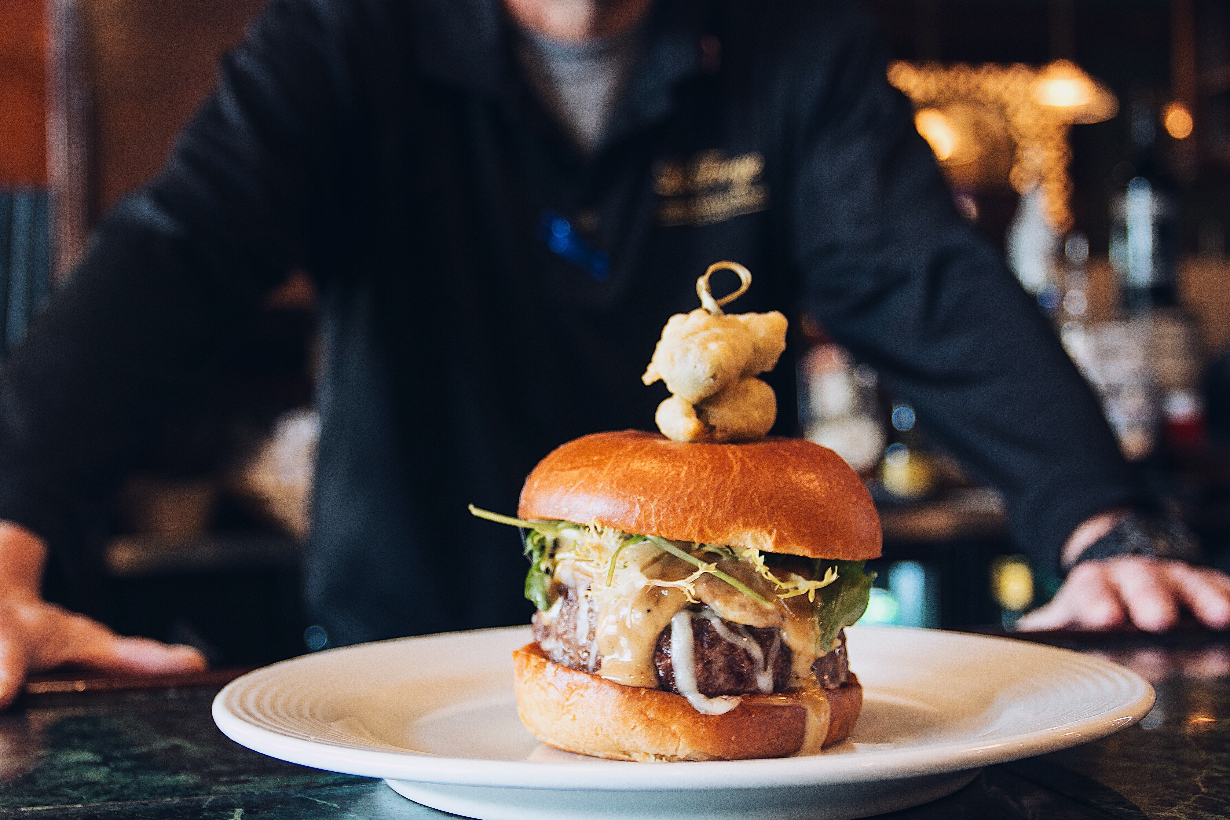 Stoneacre Brasserie: Wagyu beef patty, crowned with sweet and savory French onion caramelized onions, a luxurious layer of creamy, melted Gruyère cheese, tangy slaw dressed in a signature Stoneacre sauce, served on a soft pretzel bun and finished with an au jus on the side.