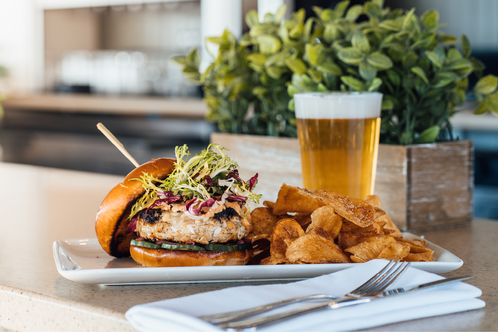 22 Bowen's Wine Bar & Grille: Dry-aged beef patty, Pecorino Moliterno, freshly shaved winter truffle, truffle aioli, crispy house-made potato chips, arugula, served on a pretzel bun.