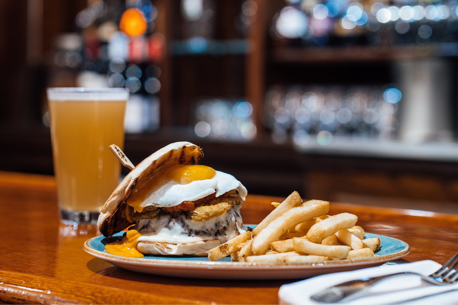 Pour Judgement: PJs beef patty, pepper jack, bacon jam, house-made onion ring, BBQ aioli & coleslaw, served on a butter toasted bun.