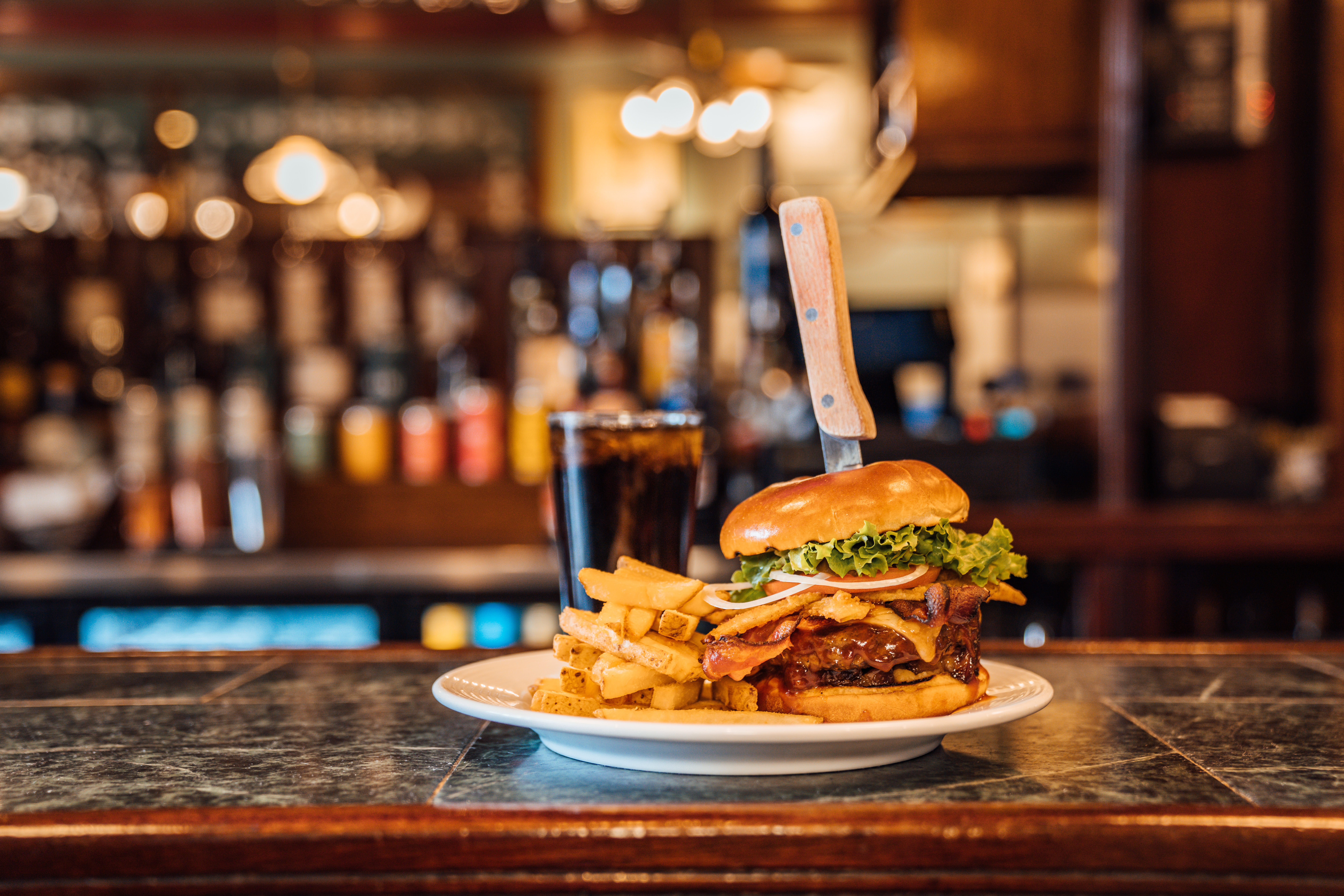 A half-pound chuck, brisket, and short rib beef patty crusted with black peppercorns and topped with applewood smoked bacon, melted Brie and our famous Cognac Dijon cream sauce, served over fries.