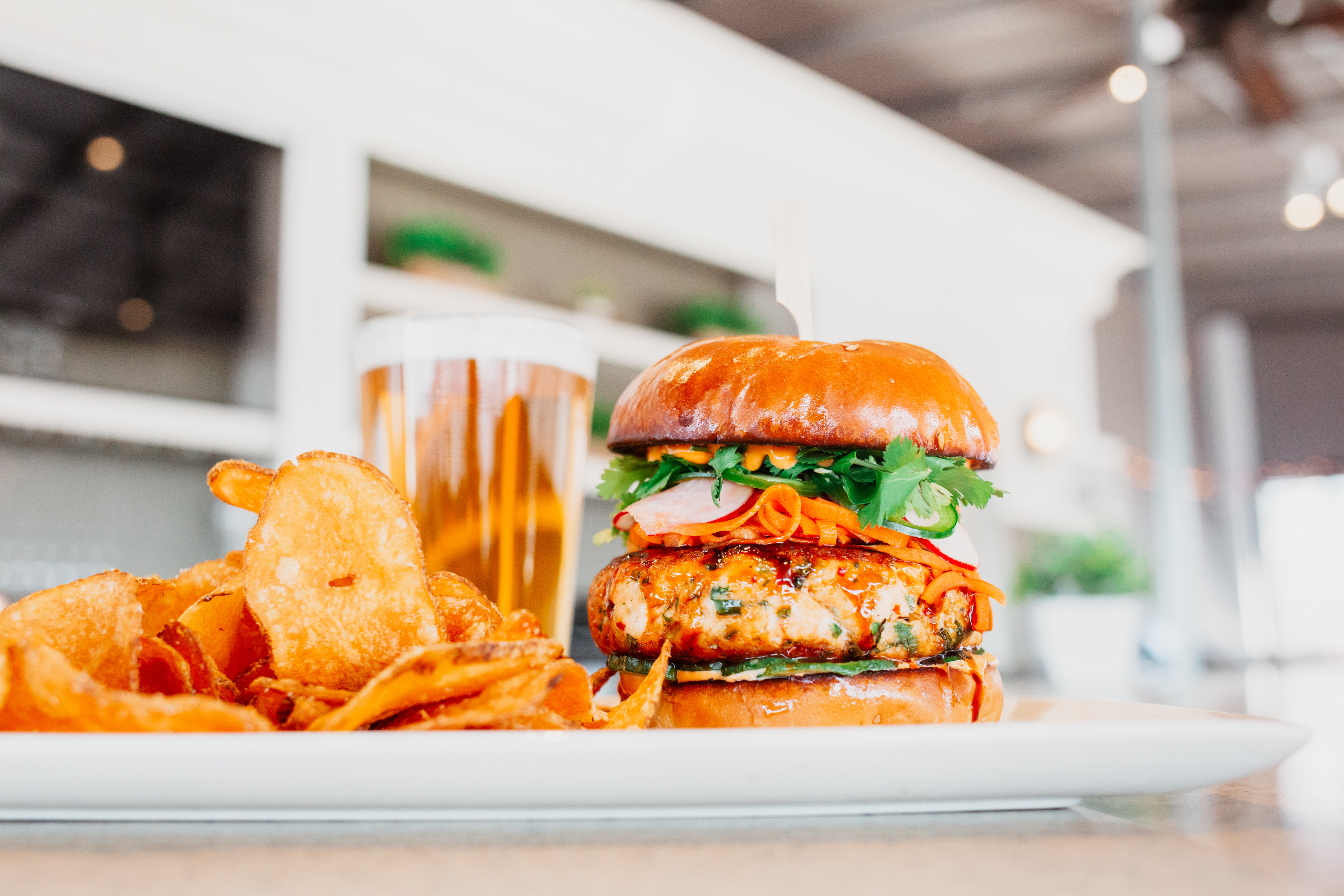 Lionhead pork patty topped with smoked carrot 1000 Island, pickled cucumbers, crunchy napa cabbage, served on a house-baked sesame milk bun, with Mission fries tossed in potato chip furikake.