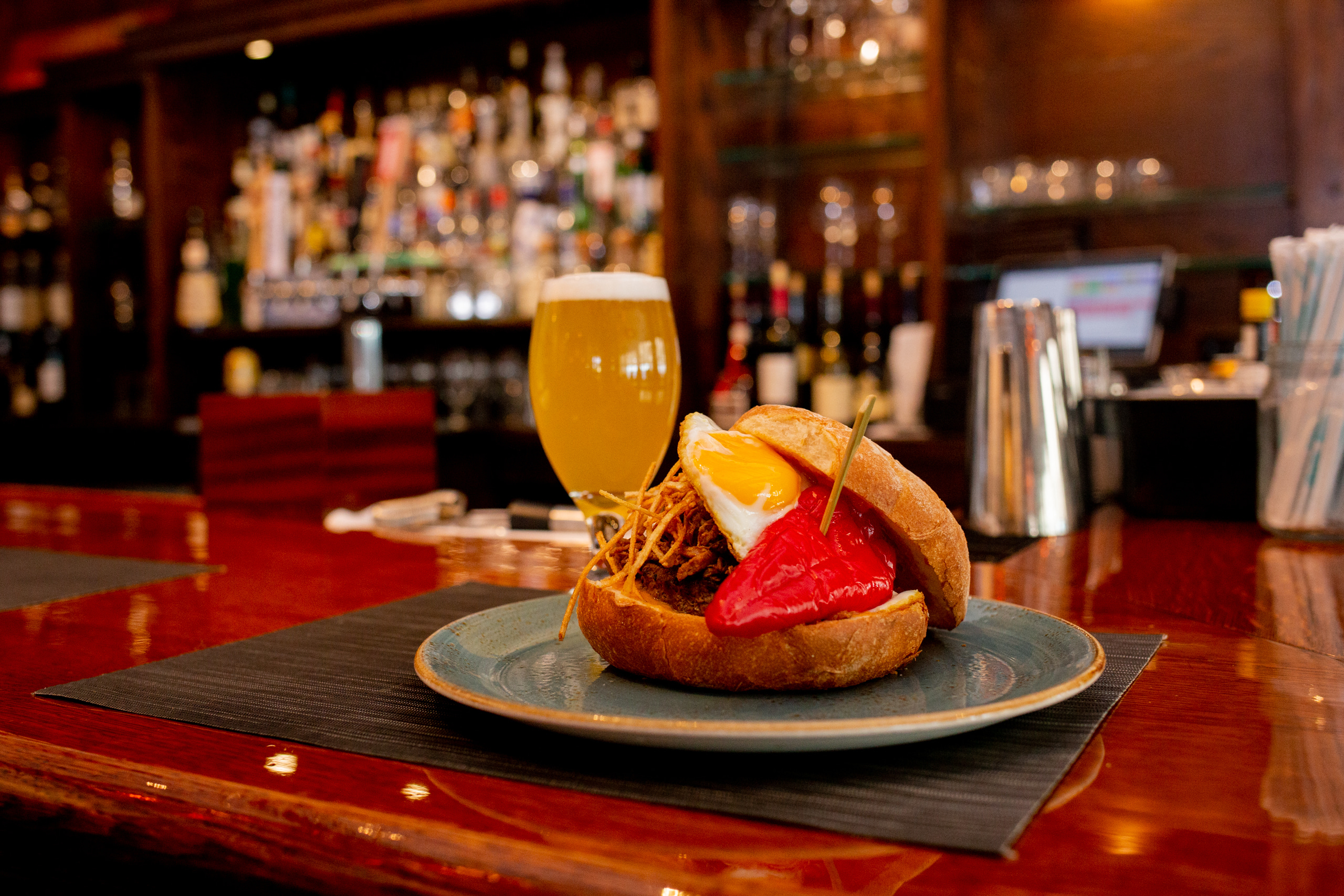 Jo's American Bistro: 8 oz. all-natural pattied burger with applewood smoked Nueske bacon, Aquidneck Hot Honey, caramelized onion, rindless Brie, lettuce and tomato, served on a Kaiser roll and garnished with a Piquillo pepper.